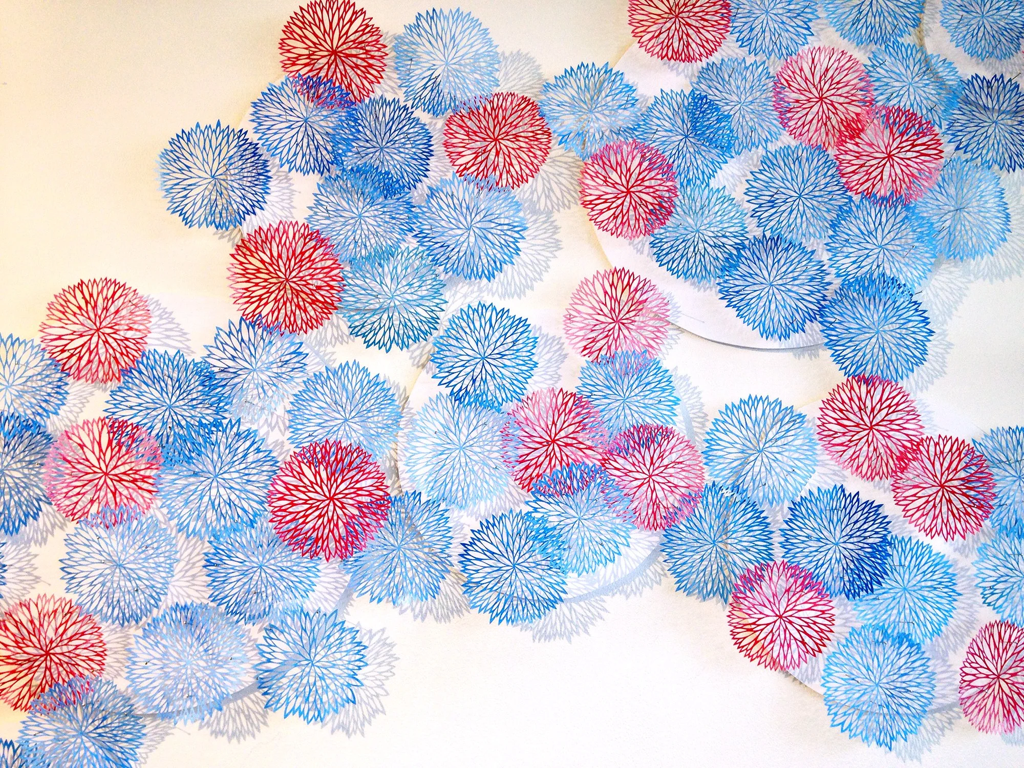 Each individual piece of the installation is hand cut from drawing paper painted with acrylic ink, and is approximately 3 inches in diameter. There are currently approximately 250 individual flowerburst pieces that can be arranged into a wall installation.